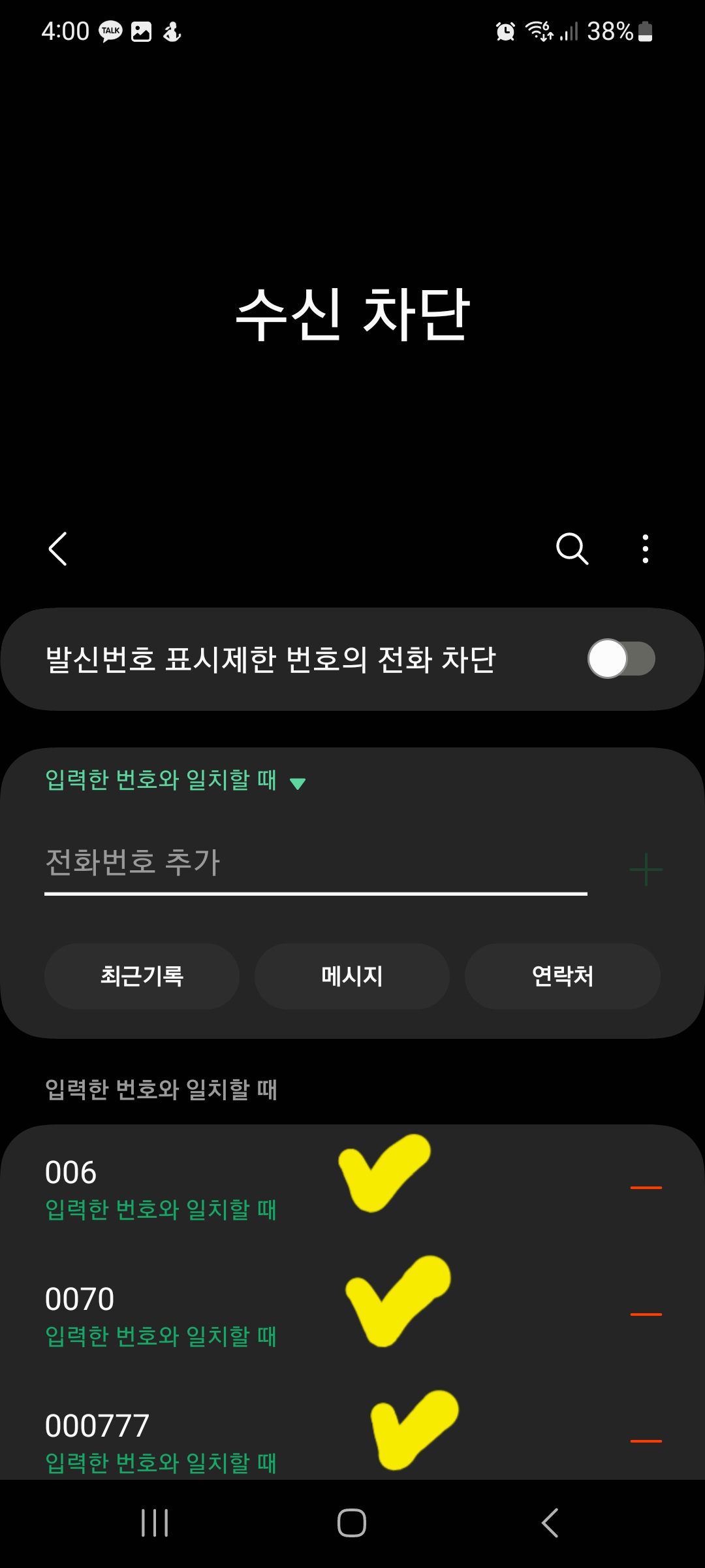 자주 나오는 단어를 추가할 수도 있고 해외 메시지 번호 중 대표적인 번호를 차단해주면 스팸으로 인식하여 자동으로 스팸메시지로 이동하게 되는거죠.